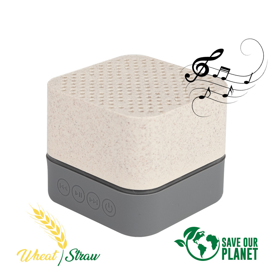 Parlante altavoz de caña de trigo (wheat straw) "LIFE" con juego de luces LED y sección inferior de silicona gris con funciones.