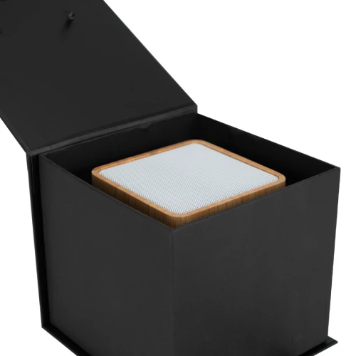 10. Embalaje: Caja de regalo en cartón lacado negro, con asas de poliéster. 11. Funciones: on/off, skip forward /louder, Play/Pause, Skip back/quieter 12. Lector de tarjeta de memoria SD card 13. Interface con cable negro USB/tipo-C 14. Rejilla metálica superior lacada color blanco