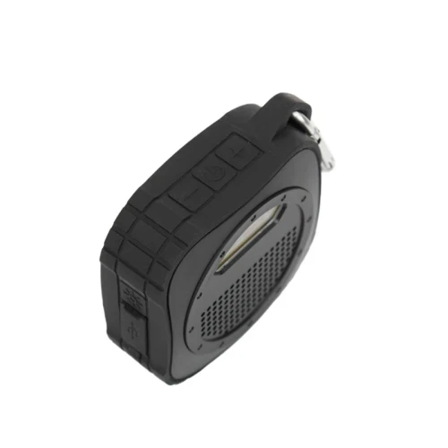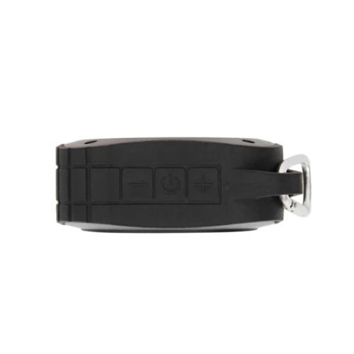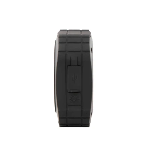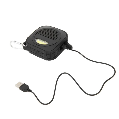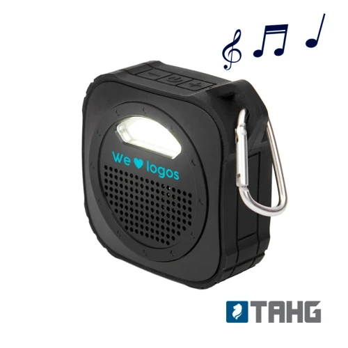 Parlante Bluetooth, con luz de 5V. Cuenta con gancho para transportarlo. Está realizado en ABS y silicona. Batería: 600mah. Medidas: 9 x 9 x 3,3 cm.