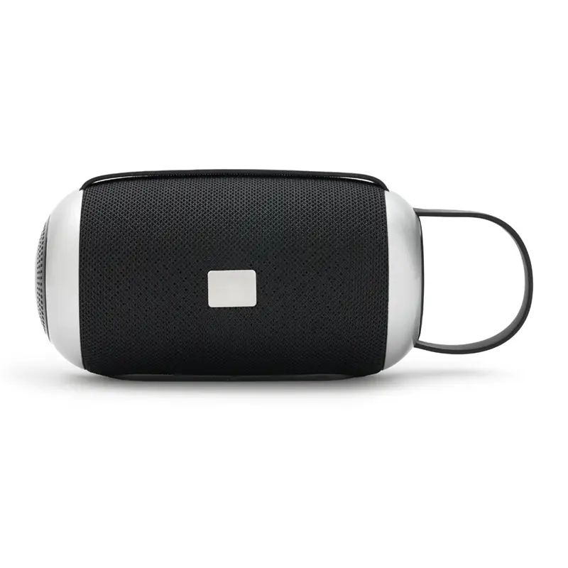 Parlante portátil Bluetooth de color negro con detalles en gris. Cuenta con una correa de agarre y una base que proporciona un mejor apoyo y estabilidad al usarlo en diversas superficies.