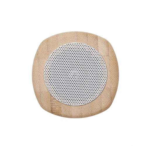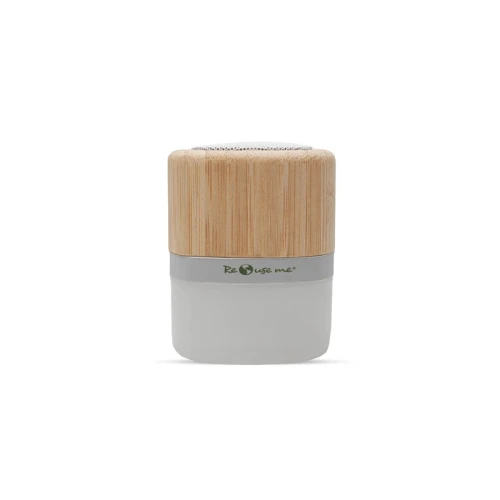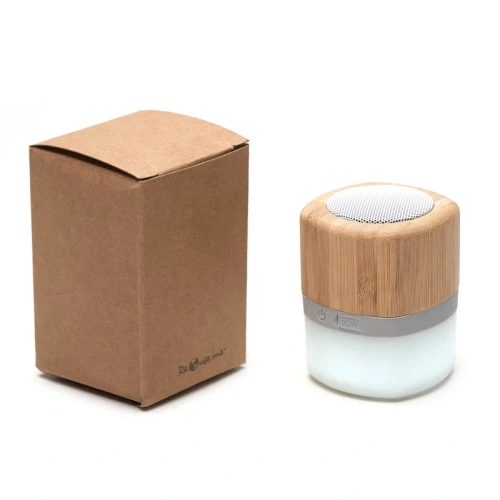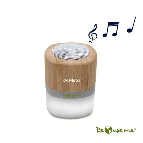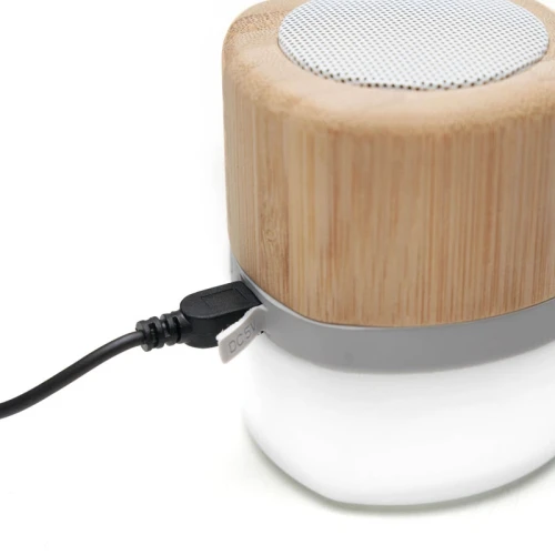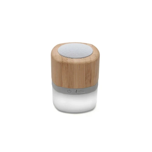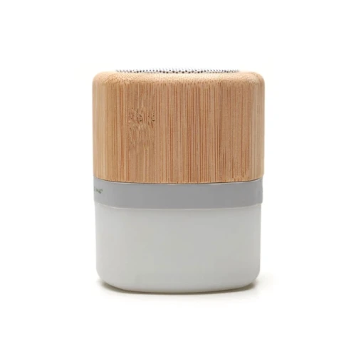 Parlante portátil con tecnología Bluetooth. Realizado en combinación de ABS con Silicona y bamboo, con iluminación en la base.