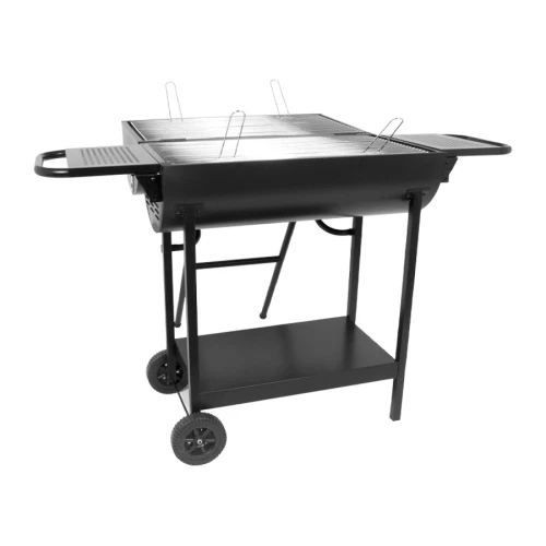 Parrilla doble a Carbón de Acero negro, modelo "Andes". Altura para cocinar: 80cm. Rejillas cromadas para cocinar: 2 unidades x 69.5 x 37cm x 4mm. Tapa: 74.5 x 40 x 20cm. Bowl para fuego: 74.5 x 40 x 20cm. Bandejas laterales: 2 unidades x 34 x 27.8cm. Incluye Manual instructivo de armado en español.