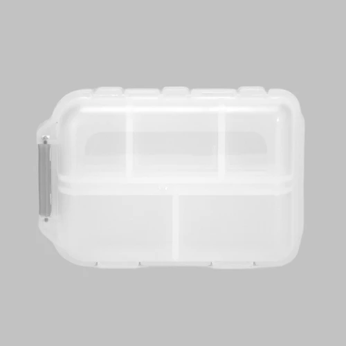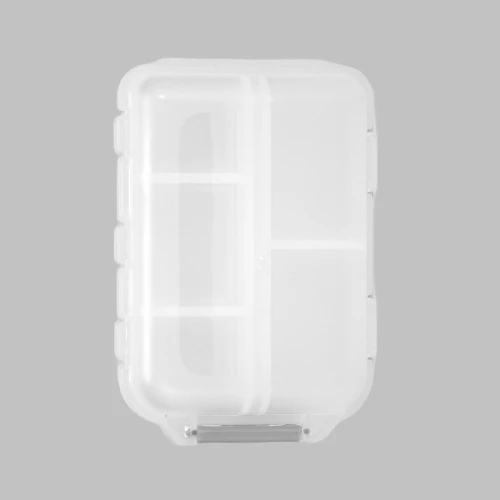 Pastillero Plástico "DOCTOR" con 10 compartimentos interiores. En PVC translúcido frozen (empavonado), con broche gris. Presentación el bolsa blanca biodegradable + caja de cartulina blanca.