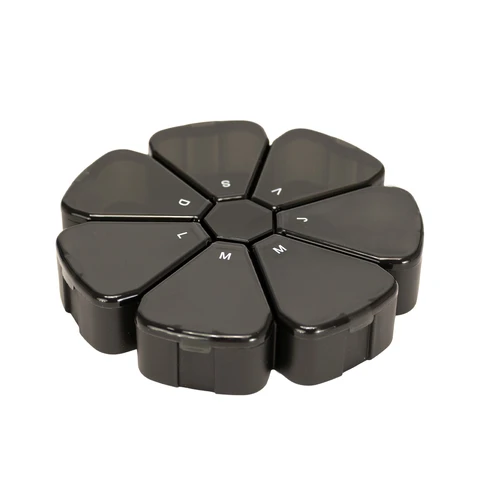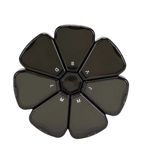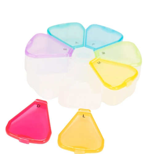 Pastillero Plástico de PVC "FLOWER" con forma de flor, con 7 compartimentos triangulares de diferentes colores translúcidos, identificados y ordenados con las iniciales de los 7 días de la semana. Presentación el bolsa blanca biodegradable + caja de cartulina blanca.