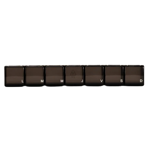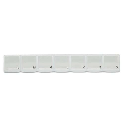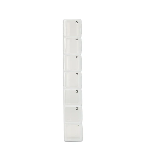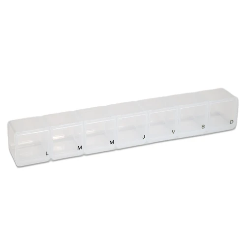 Pastillero Plástico de PVC "TREN", con 7 compartimentos interiores, identificados y ordenados con las iniciales de los 7 días de la semana. Presentación el bolsa blanca biodegradable + caja de cartulina blanca.