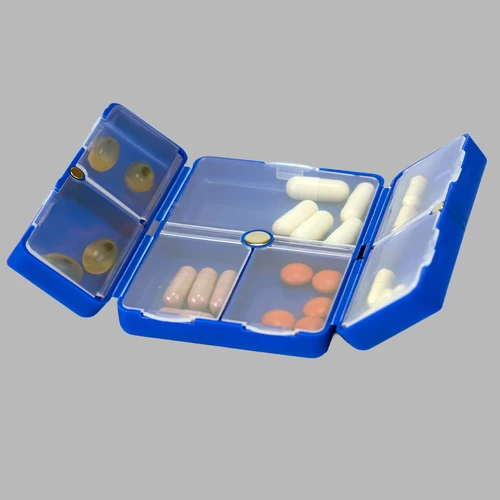 Pastillero semanal "CARE" de Polipropileno (PP). Cuenta con 7 compartimentos interiores de PVC translúcido y apertura doble tipo "libro", con cierre interior imantado. Presentación el bolsa OPP + caja de cartulina blanca.