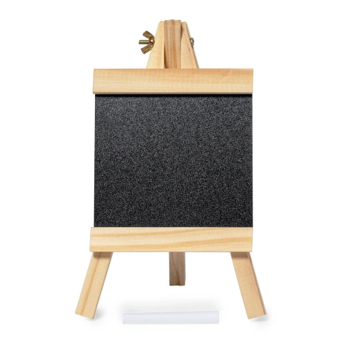 Original atril con pizarra hecha en madera, con tiza incluida. Presentado individualmente en caja de diseño kraft.