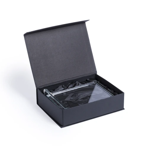 Placa trofeo de grueso cristal con elegante diseño rectangular y resistente base. Especialmente diseñada para marcaje a láser y presentada en estuche de protección individual.