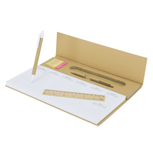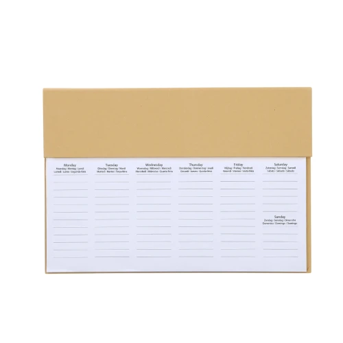 Planificador semanal de mesa. Disponible en 7 idiomas (español, inglés, francés, portugués, alemán, neerlandés, italiano). Incluye: - 125 hojas para planificación semanal - 25 notas adhesivas medianas y 100 mini-notas adhesivas en diferentes colores - Bolígrafo de de mecanismo pulsador, cuerpo en cartón reciclado y tinta azul - Regla de madera - Tapa rígida en cartón reciclado - Lámina protectora de plástico El cartón reciclado proviene del reaprovechamiento de excedente de fabricaciones y reciclaje de papel en el final de su vida útil, convirtiéndose en un lienzo ecológico y sostenible.