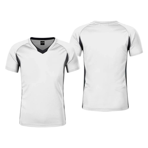 Fina Polera deportiva 100% poliéster de 140gr/m2, para HOMBRE, bicolor detalles negros. Cuello en "V", manga corta. Ideal para uso en fútbol, futsal, baby, vóleibol. Presentación individual en bolsa de polipropileno transparente.