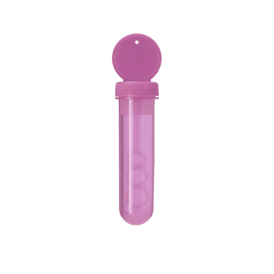 Pompero con aplicador especial que permite crear pompas en 3 tamaños. Líquido incluido (30 ml). Con tapadera de color sólido y cuerpo translúcido. 30 ml. Líquido Incluido