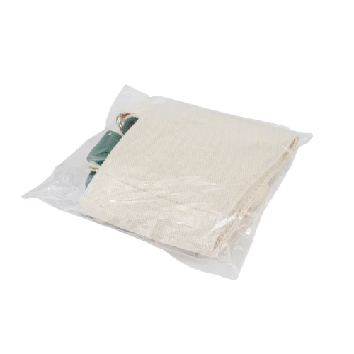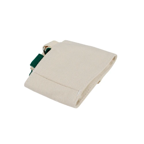 Porta-Lata o vaso de café colgante, en tela Canvas de 10oz color natural. Contiene soporte de color verde y lanyard colgante removible de 84 cm. de largo.