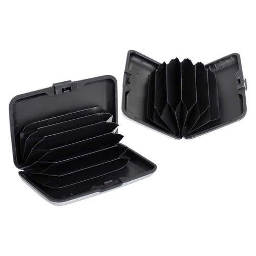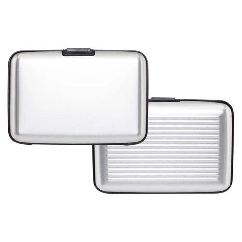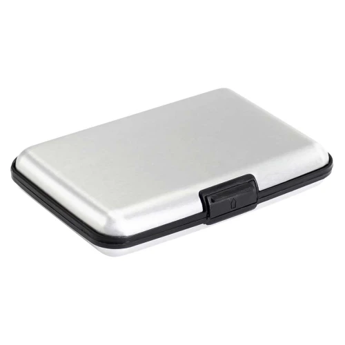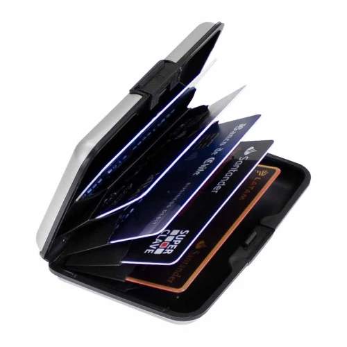 Estuche rígido Porta-Tarjetas (tamaño Tarjeta de Crédito) con protección anti-clonación o Escaneo RFID. Capacidad interior para 6 Tarjetas. Presentación en bolsa de polipropileno y Estuche plateado de Regalo.