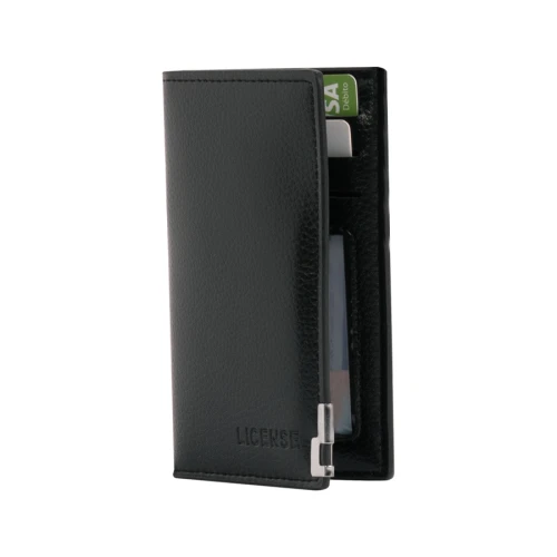 Billetera portas-tarjetas de eco-cuero negro, formato vertical, modelo "LICENSE". Contiene 8 compartimentos interiores. Presentación en bolsa frozen y caja de cartón forrado negro opaco.