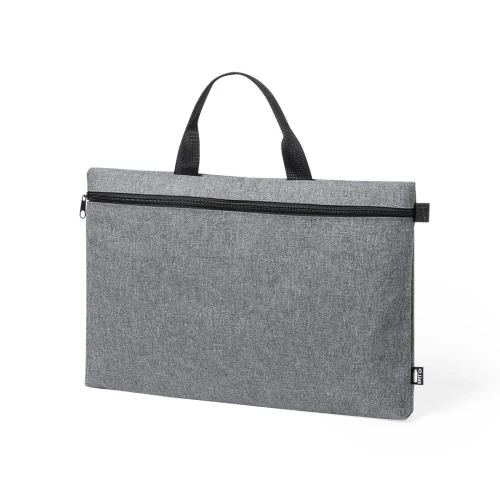 Portadocumentos de línea nature y en resistente 600D RPET efecto melange, elaborado a partir de plástico reciclado para así fomentar la reutilización de residuos plásticos y contribuir a la sostenibilidad del planeta. Detalles en negro y compartimento principal con cierre de cremallera. Resistentes asas a juego y distintivo RPET en etiqueta exterior.