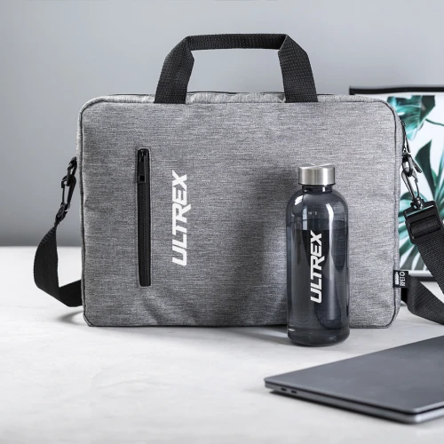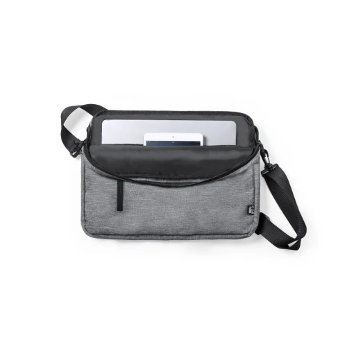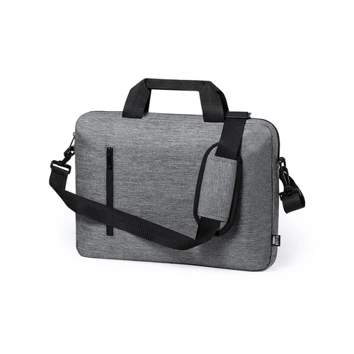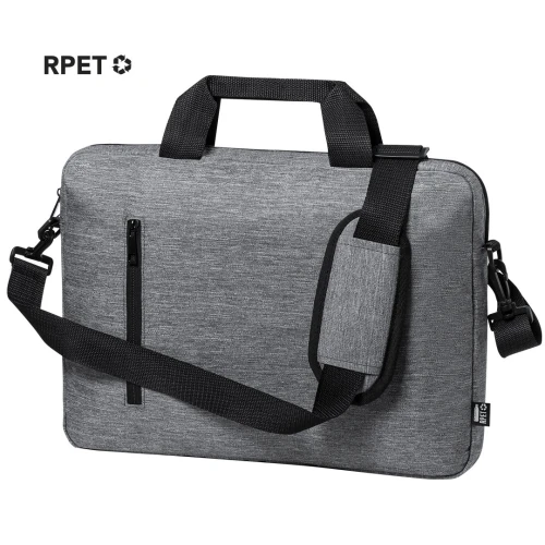 Elegante portadocumentos de línea nature en resistente 600D RPET efecto melange, elaborado a partir de plástico reciclado para así fomentar la reutilización de residuos plásticos y contribuir a la sostenibilidad del planeta. Detalles en negro, incluye compartimentos interiores acolchados para ordenador de hasta 15 pulgadas y tablet de hasta 10 pulgadas. Accesorio en parte posterior para anclaje al trolley, bolsillo exterior con cierre de cremallera, cómodas asas reforzadas, cinta bandolera ajustable con cierre de mosquetón y almohadilla para hombro a juego. Distintivo RPET en etiqueta exterior.