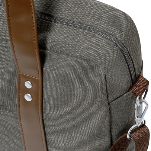 Portadocumentos bandolera de diseño atemporal, fabricado en resistente canvas de 475 g/m2, color gris, con cintas en polipiel y práctica cinta para hombro ajustable. Interior acolchado con compartimento ordenador portátil de hasta 15 pulgadas. Incluye práctico bolsillo en el exterior. Presentado en bolsa individual reciclada.