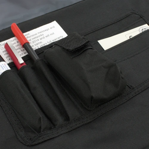 Portadocumentos con solapa de cierre de velcro en poliéster 600D con elegante tira frontal en color negro. Con asas de transporte reforzadas y cinta bandolera ajustable. Compartimentos interiores para bolígrafos y funda para smartphone en PVC con función táctil.