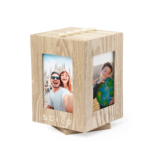 Original portafotos cubo fabricado en madera natural. Su diseño en forma de cubo permite mostrar las 4 fotos más destacadas del álbum y, además, cuenta con una base giratoria 360º. Ideal para fotos de hasta 13,5x9 cm. Presentado en caja individual de diseño kraft.