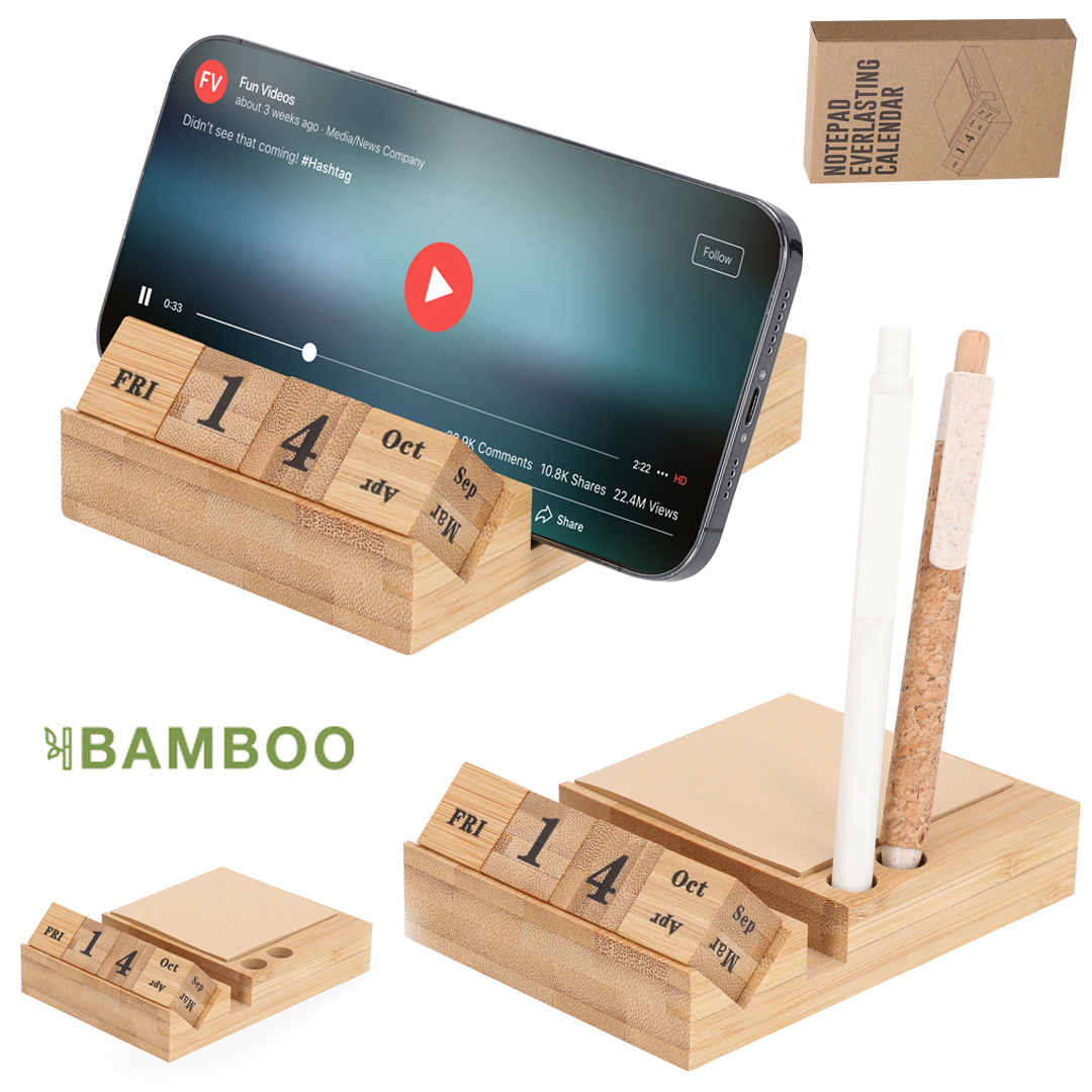 Portanotas calendario perpetuo con soporte, fabricado en bambú. Este elegante calendario perpetuo está compuesto por cubos que indican los días de la semana, los meses y los días del mes. Incluye soporte para smartphone, 100 notas adhesivas de papel kraft y soporte para dos bolígrafos. Perfecto para mantener tu escritorio organizado y estilizado.Materiales como el Bambú fomentan la utilización de materias primas naturales reduciendo las emisiones contaminantes. Además, el Bambú proviene de una planta de gran resistencia y versatilidad, con crecimiento y regeneración rápida, siendo una excelente alternativa al uso de madera tradicional. 100 Notas Adhesivas 7.6 x 7.6 cm