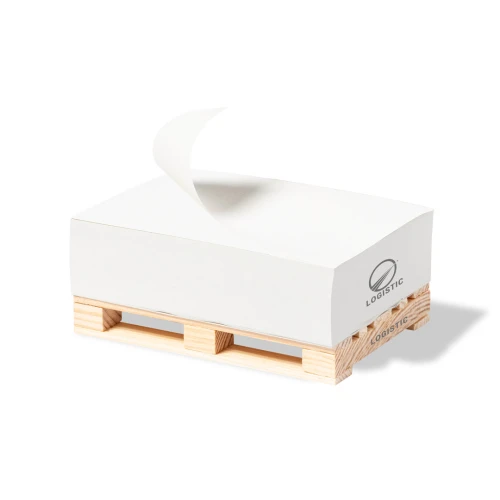 Original portanotas palet fabricado en madera natural. Incluye 300 hojas en papel eco y fajín en papel kraft con distintivo EcoPaper.