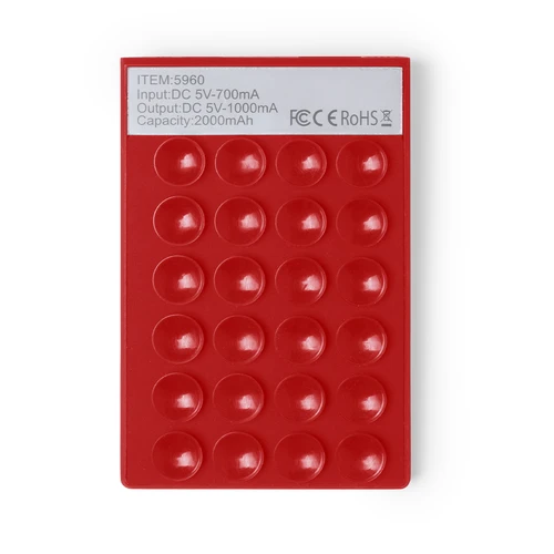 Batería auxiliar externa -2.000 mAh- con superficie de ventosas adherentes y anilla/soporte para selfies. Con conexiones para entrada/salida de corriente micro USB y USB. Ledes indicadores de estado de carga, diseño curvado plano y amplia superficie de marcaje. Presentada en atractiva caja de diseño. Las capacidades mostradas en todas nuestras baterías auxiliares externas son reales, incorporando todas ellas baterías de grado A y no recicladas, con una vida útil de al menos 500 ciclos de carga y según normativa CE. Además, están fabricadas conforme a los estándares RoHS y en cumplimiento con los siguientes requisitos de seguridad: Sistema de protección contra sobrecarga del power bank. Sistema de protección contra descarga completa que proporciona una mayor durabilidad del power bank. Sistema de bloqueo para evitar cortocircuitos. Sistema de transferencia de carga constante, acorde con la capacidad del dispositivo de destino.