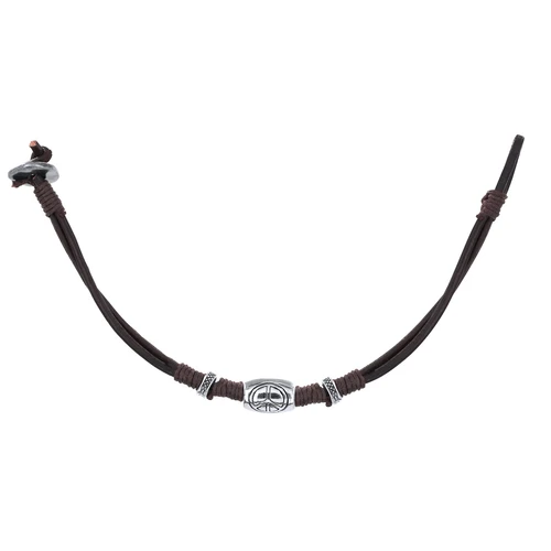 Pulsera de piel marrón adornada con cordones de algodón encerados a juego y abalorios plateados, incluyendo un charm con el símbolo de la paz. Cuenta con un original cierre de aleación de zinc en tono plateado. Presentada en cartón kraft con superficie lisa para el marcaje.