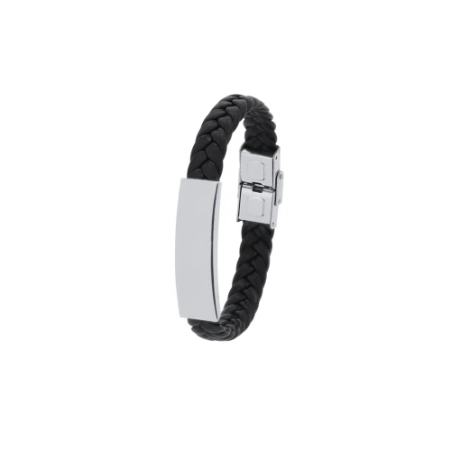 Pulsera de piel sintética negra adornada con placa fabricada en acero inox pulido de diseño plano. Cuenta con un original cierre de seguridad.