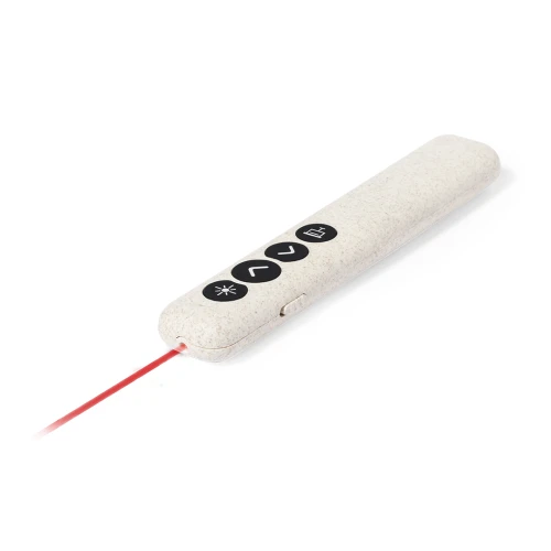 Elegante puntero láser de clase 2 con conexión USB fabricado en caña de trigo. Especialmente diseñado para presentaciones PowerPoint y Keynote, incorpora pulsador de activación lateral, con botones de avance, pausa y retroceso. Con cuerpo especialmente diseñado para marcaje en tampografía. Alimentación a pilas: 1xAAA incluida. Presentado en caja de diseño kraft, con manual de instrucciones en español e inglés.La caña de trigo fomenta la utilización de materias primas naturales, reduciendo así las emisiones contaminantes.
