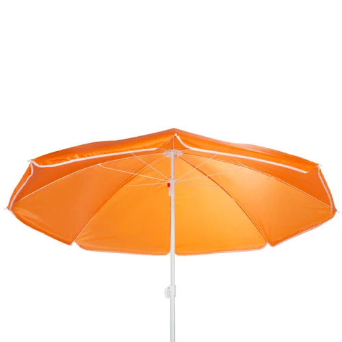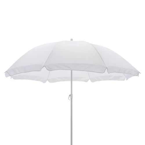 Quitasol de 8 cascos en tela Nylon 190T. Incluye 2 varas metálicas blancas desmontables, la inferior de 101 cm y la superior de 95 cm. Presentación en funda de PVC transparente con broche.