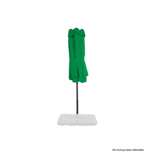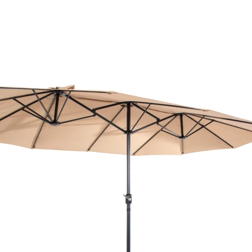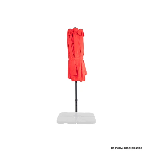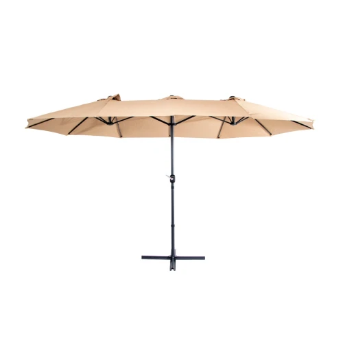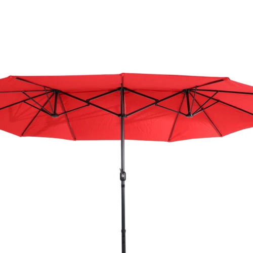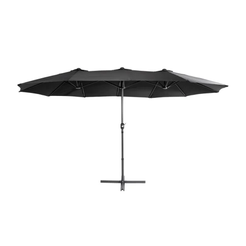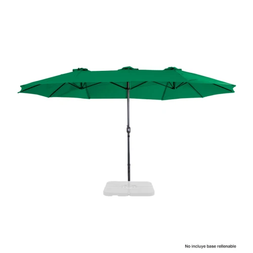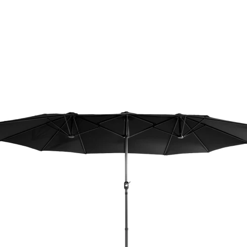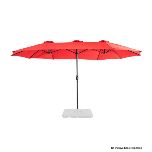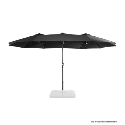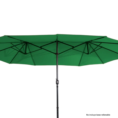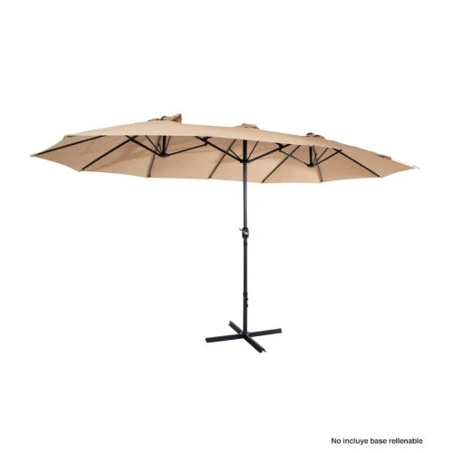Quitasol ovalado doble de 4.55 x 2.7 m, modelo "Twins", con 12 cascos de lona Poliéster UV impermeable de 180g. Contiene varas reforzadas de Acero recubierto de 12 x 18mm, asta de Acero recubierto de 48mm, sistema de apertura automático con manivela.