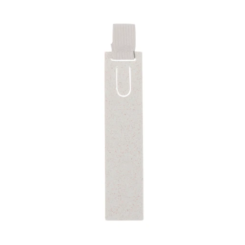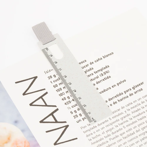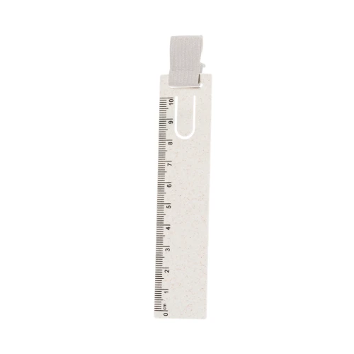 Original regla marcapáginas hecho en caña de trigo. Práctico utensilio de medida de hasta 10cm con pestaña para usar como marcapáginas y goma elástica para sujetar bolígrafos. Fabricado en caña de trigo y poliéster. Presentado individualmente en una bolsa de papel reciclada. La caña de trigo fomenta la utilización de materias primas naturales, reduciendo así las emisiones contaminantes.