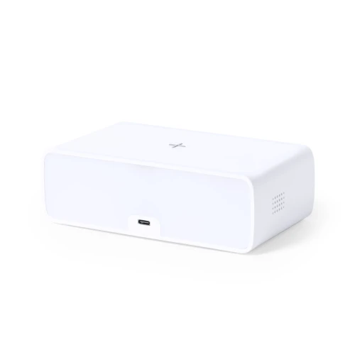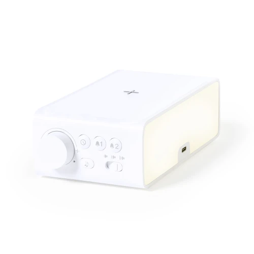 Reloj multifunción de elegante diseño en color blanco con cargador inalámbrico de 10W integrado y lámpara led integrada. Con función fecha/hora, alarma y lámpara de 36 ledes con intensidad de luz regulable. Conexión USB, con cable Tipo C incluido de 100 cm y alimentación auxiliar a pilas de botón (incluida). Compatible con dispositivos equipados con tecnología de carga inalámbrica. Presentado en atractiva caja de diseño.En cumplimiento con los requisitos de seguridad: Sistema de protección contra sobrecalentamiento. Sistema de protección contra sobrecarga.