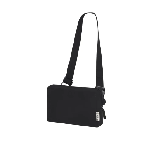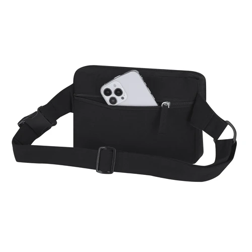 Riñonera rectangular en algodón reciclado. Con bolsillo central cierre de cremallera, doble tirador y cinta ajustable con cierre de hebilla a juego. Además, incluye bolsillo en la parte posterior. Con distintivo de algodón reciclado.