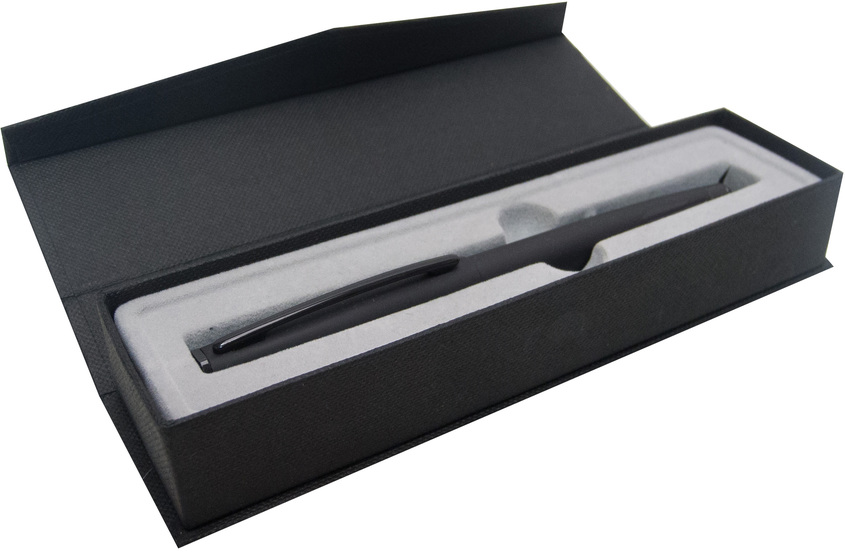 Metal. Roller. Cuerpo de color negro mate, clip con detalles en color negro brillante. Tinta negra. Con estuche de cierre imantado. Destape electroplateado en la parte superior. Presentación en estuche con cierre magnético.