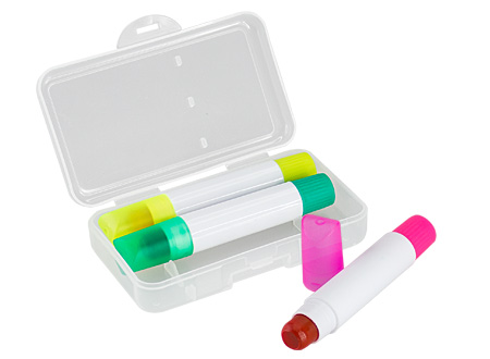 Set de 3 Destacadores de Cera, con dosificador, presentación en Estuche de Plástico transparente. No se secan.