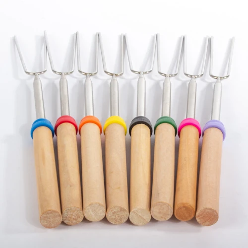 Set de 8 Tenedores telescópicos para la parrilla. Cada tenedor contiene mango de madera de pino e incluye anillo plástico distintivo de diferente color. Presentados dentro de bolsa de tela poliéster negro.
