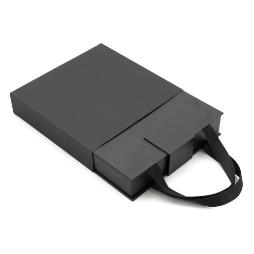 Elegante set que incluye un cuaderno A5 rayado (80 g, 100 hojas, 21 x 14 cm), un lapiz de tinta azul y un llavero, todo presentado en una caja negra mate con correas para transportar fácilmente. Es un producto ideal para regalar en eventos corporativos o fechas especiales.