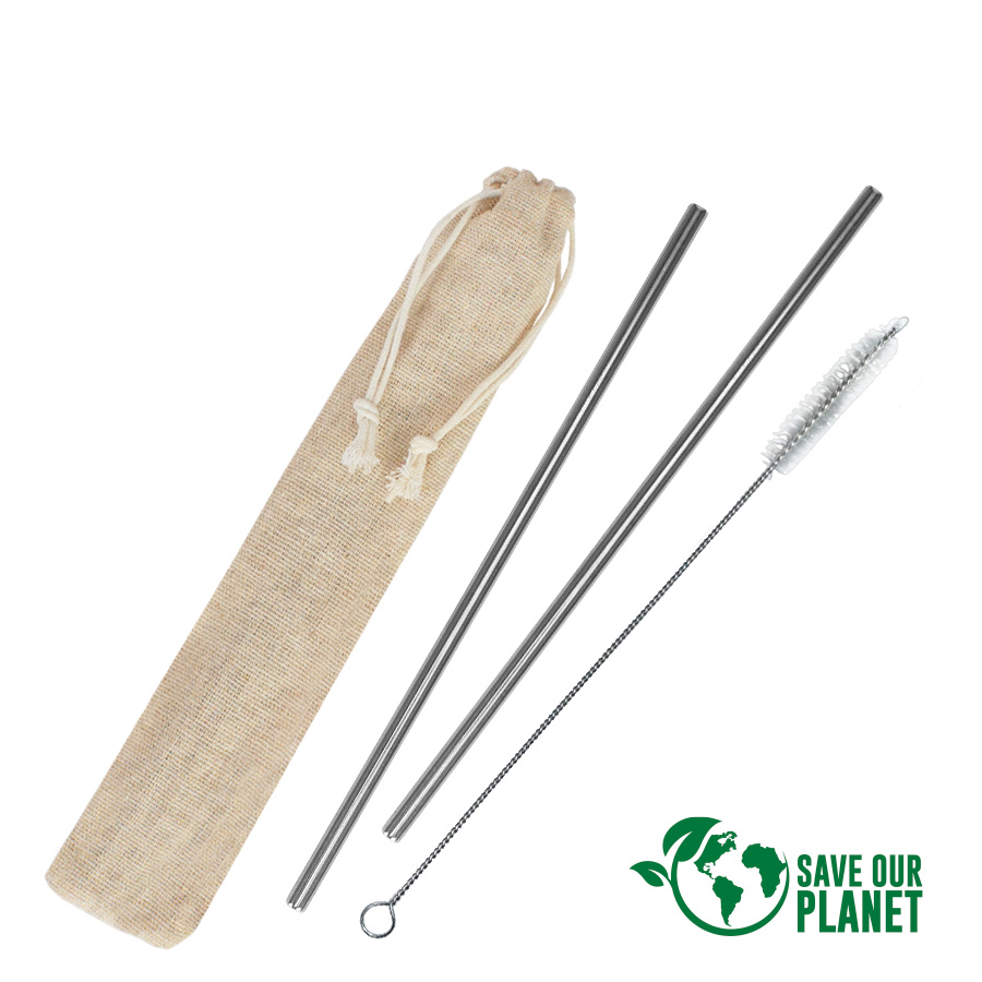 Set de 2 bombillas de acero inoxidable de 21.5cm. de largo c/u + cepillo para limpiar de 22cm de largo , presentados en bolsa de Lino tipo saco color natural de 23.5 x 4 cm. Cuenta con asa-cordón retraíble de Algodón, en la parte superior de la bolsa.