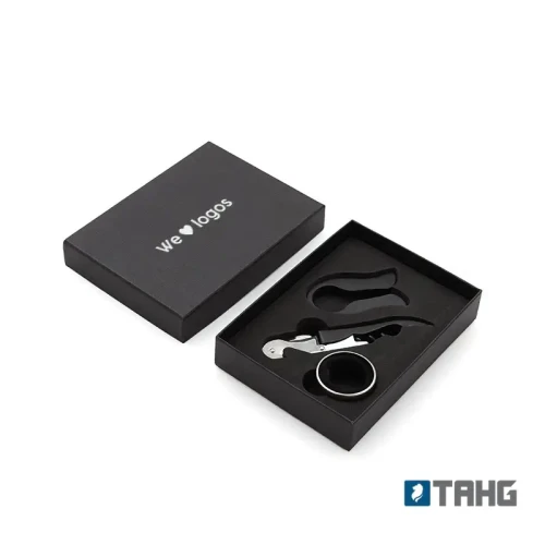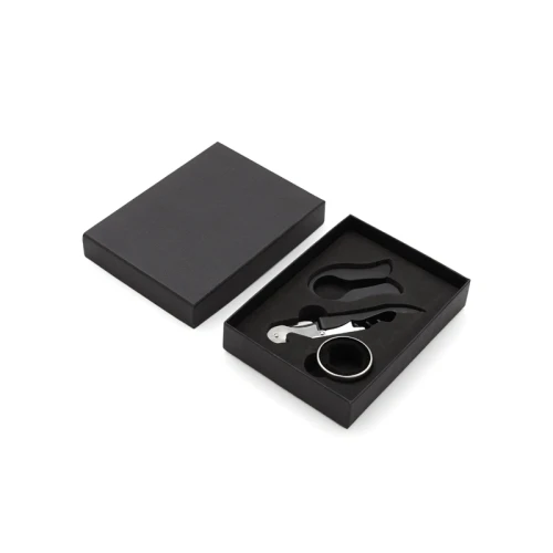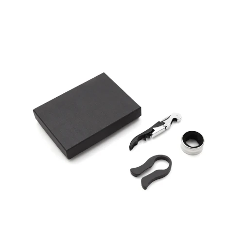 Set de accesorios de 3 piezas que necesitas para disfrutar mejor de tu vino. Incluye sacacorchos en dos tiempos, anillo cortagotas, y corta sello. Viene presentado en una caja negra de 13 x 15 cm. Ideal para hacer un regalo original y práctico a un amigo o familiar.
