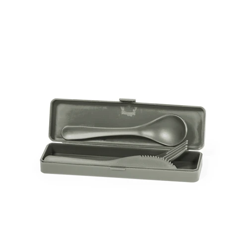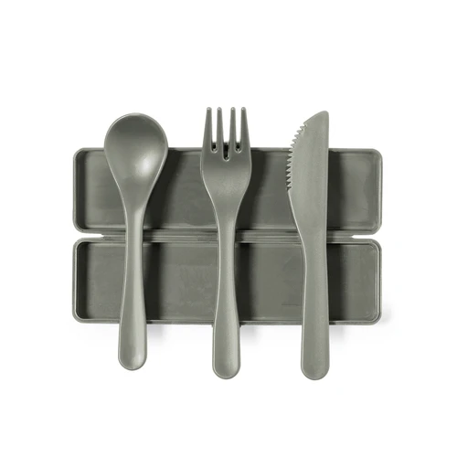 Set de cubiertos fabricados en PP reciclado libre de BPA, con estuche de presentación a juego. Incluye cuchara, tenedor y cuchillo. Dispone de Certificación Food Grade, garantizando la seguridad cuando los alimentos entran en contacto con el material usado para fabricar el producto. Estuche esterior y cubiertos en acabado mate disponibles en variada gamas de colores. Presentados en bolsa individual reciclada.El PP reciclado es un plástico reciclado y altamente reciclable, de gran resistencia y apto para multitud de aplicaciones.
