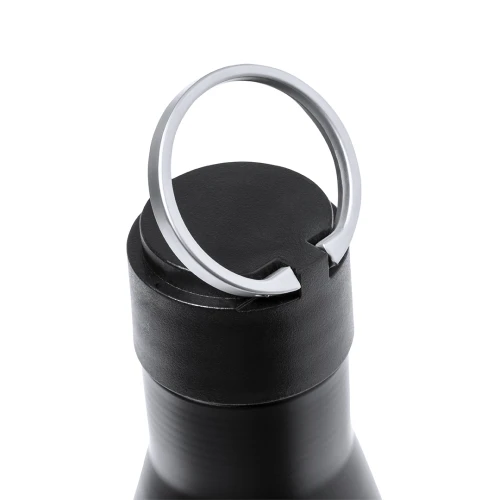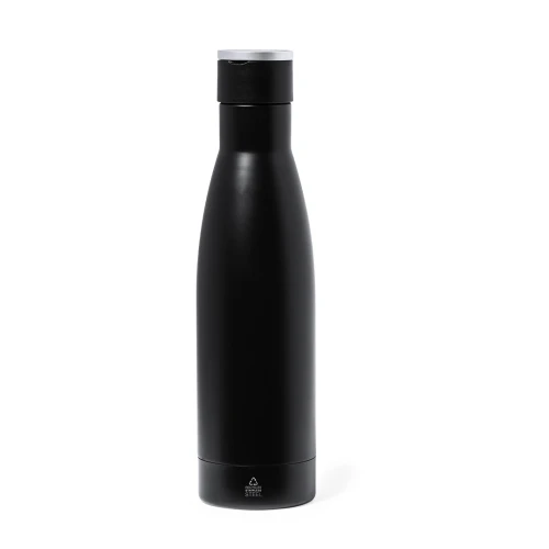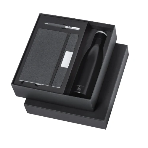 Elegante set premium que incluye: Termo de doble capa en Acero Inox Reciclado de acabado negro mate y de 500 ml de capacidad, con asa rígida de metal color plata mate. Con logotipo acero inox.Bloc de notas en RPET en elegante color negro, con detalle metálico especial para marcaje en láser. Incluye cierre elástico y marcapáginas de tela. Interior con 80 hojas de disposición a una raya. Con logotipo RPET.Bolígrafo en RPET de acabado negro mate, de mecanismo giratorio y tinta azul. Con clip y puntera en pulido metal. Set presentado en estuche individual de acabado mate, con troquelado interior para cada uno de los elementos del set.El material RPET se elabora a partir de plástico reciclado, para así fomentar la reutilización de residuos plásticos y ayudar a la sostenibilidad del planeta.