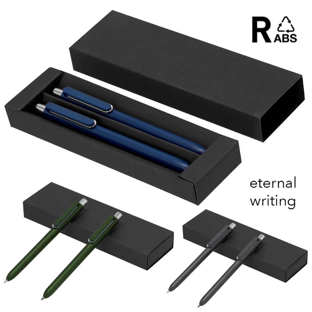 Set compuesto por un bolígrafo de tinta azul y un lápiz eterno, ambos fabricados en RABS. El lápiz eterno ofrece escritura continua, evitando generar residuos, y ambos cuentan con mecanismo pulsador. Diseñados con clip a juego y detalles cromados. Presentados en estuche de cartón reciclado de color negro. Con distintivo de RABS impreso. Bolígrafo y Lápiz Eterno