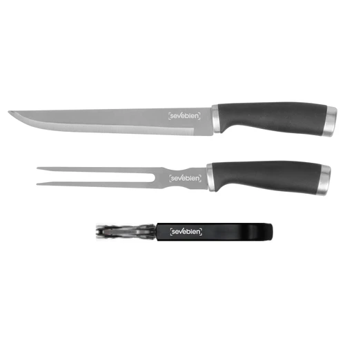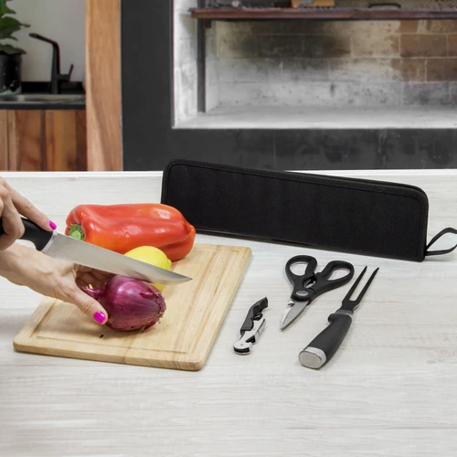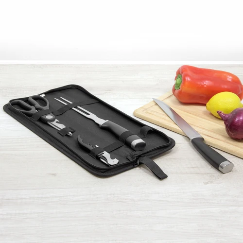 36 x 9,5 x 3 cm. Acero inoxidable y polipropileno + Nylon. Set de asado en estuche con cierre. Contiene: tenedor , asador y cuchilla con mango color negro. Trae tijera y destapador de vino.(Las medidas volcadas son las del estuche).