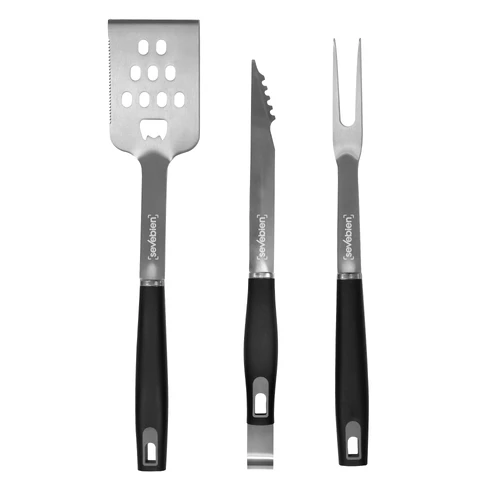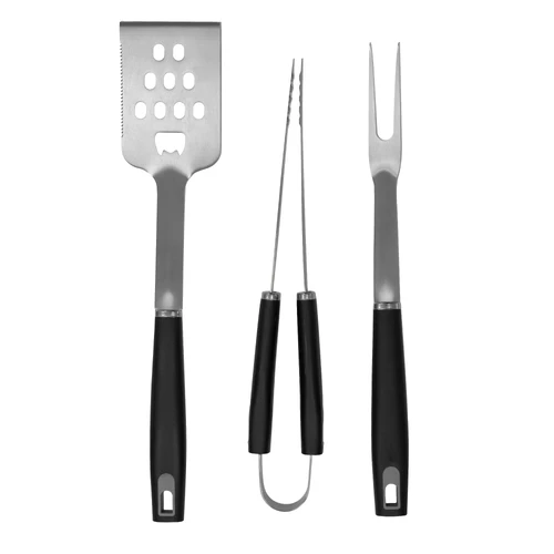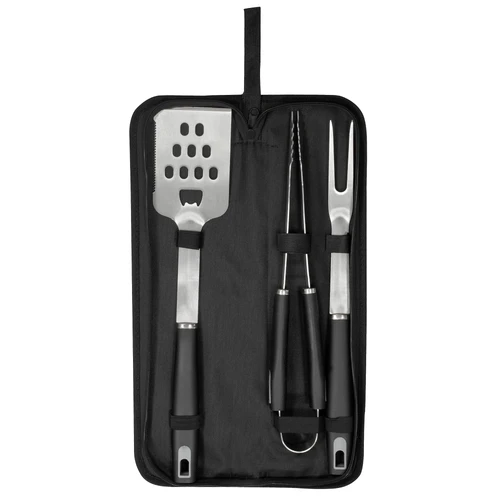 46,5 x 12 x 4,5 cm cerrado. Acero inoxidable y polipropileno + Poliéster. Set de asado en estuche color negro con cierre. Contiene 3 utensilios de acero inoxidable 420: tenedor de 135g y 41 cm de largo; pinza de 275g y 39 cm de largo; y espátula de 225g y 43 cm de largo, todos con mango de polipropileno en color negro. Espátula multipropósito (recoge, escurre, corta y destapa). Calidad premium. Estuche con cierre.