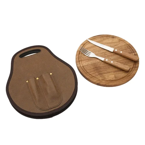 Set de asado con tabla y utensilios. Hecho de madera de acacia, cuero y acero inoxidable. Cuenta con tabla redonda con mango, cuchillo y tenedor, todo guardado en una bolsa de cuero con cierre tipo estríbo. Es ideal para disfrutar de un asado al aire libre o en casa en un formato compacto y funcional. Pampa Spirit