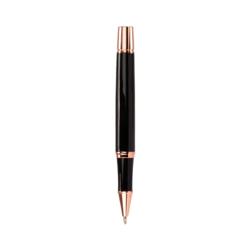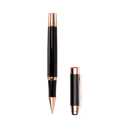 Set de Escritura "THORTON", incluye Bolígrafo metálico negro con terminales encobrizados + Roller pen metálico negro con terminales encobrizados. Presentación en elegante estuche de PU negro con ribete metálico plata opaco bruñido, interior cuna aterciopelada blanca. Sobre funda de papel color negro..