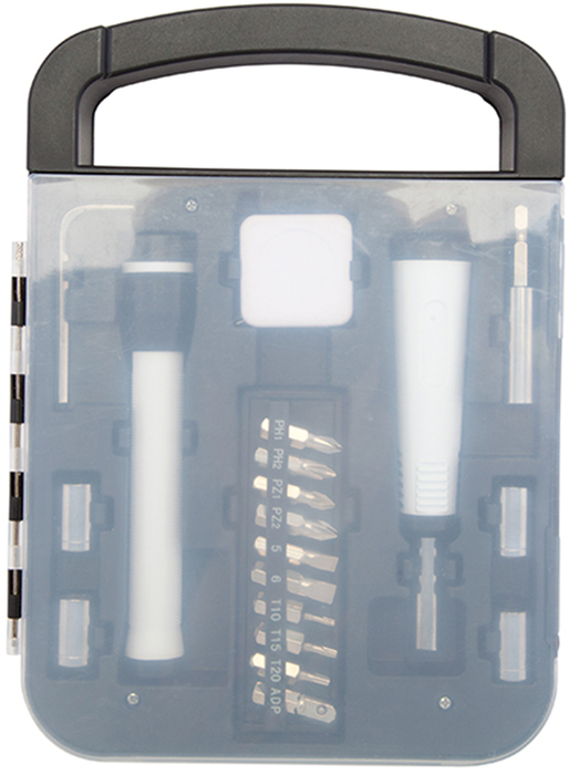 22 x 16 x 2,5 cm. Plástico. Set de herramientas de 19 piezas. Contiene: linterna, cinta metrica, multi desarmador con juego de 10 puntas (4 phillips, 2 planas, 3 hexagonales y 1 adaptador para acople). Acople para llave tubo 7, 8 , 9 y 10 mm y llave allen. Presentación en caja de regalo.