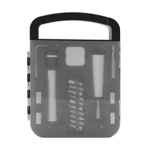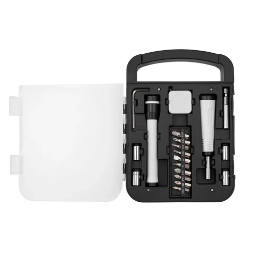 Set de herramientas, con en maletin de tapa transparente. Incluye: Llave allen, linterna, metro extensible, destornillador de puntas intercambiables. Medidas: 22 x 16 x 2,7 cm.