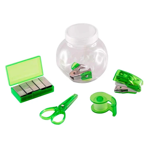 Set de oficina en frasco plástico transparente con tapa frozen. Ideal espacio para logo en tapa.